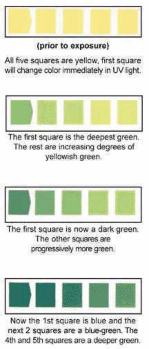 They are the first product that can be used to determine levels of UV dose with a simple, visual inspection due to the 5 separate color changing zones. Each of the 5 zones begin to change color after a specific amount of UV dose has been received.